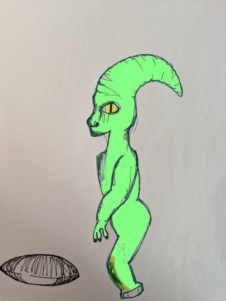 HS They have one big horn coming out of flesh head backward. They have heads, arms & legs, big heart, and yellow eyes. They are very curious, and they look like chameleon.